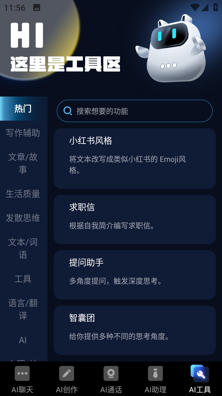 这是一款能够智能聊天对话、智能写作文章和AI绘画生成的APP。你可以随时随地和它交谈聊天你也可以输入自己感兴趣的关键词,它就能自动生成对应的各种各样的作文、诗歌、学习计划等。